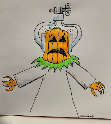 And for Days 3 and 6 (I wanted to get as many done as possible) I drew Boo Berry the cereal mascot, escaping from the bottle in which he'd been encased. And on the table alongside the bottle are a couple of relevant books as well!